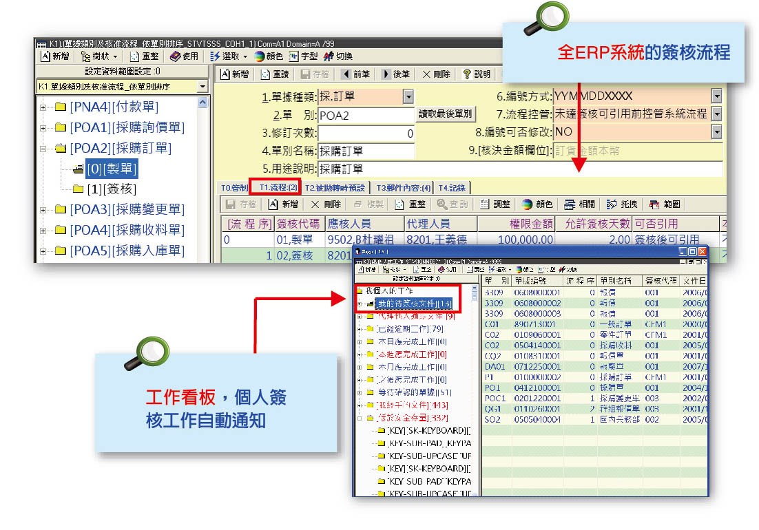 依公司流程自訂各作業之簽核關卡 , 並可依權限金額來控管 , 更可由mail主動通知。