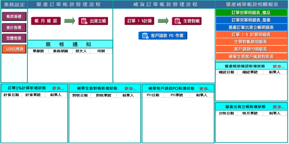 A.各作業皆可設定審核流程 , 透過警訊功能即時了解各作業已新增未送審OR已送審未簽核的單據。