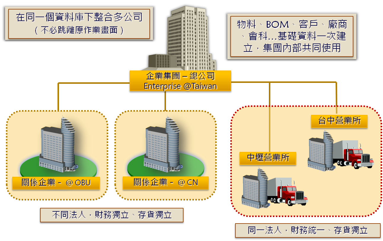 以企業多公司為基礎設計 , 公司間可以獨立進行、內部往來、帳務獨立核算 , 一張報表即可合併呈現。
