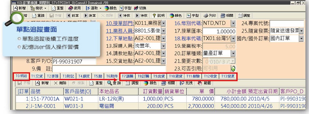 於單據源頭(如訂單、製令單等)即可於同一作業畫面追蹤其後續工作進度。