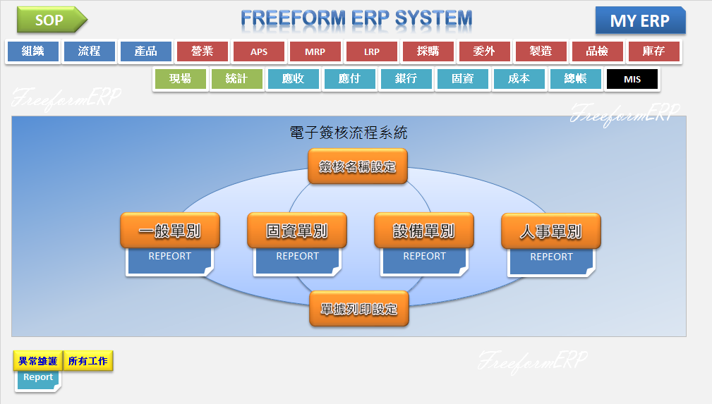 Freeform ERP 系統之每一單據均可配有多組不同之簽核流程。