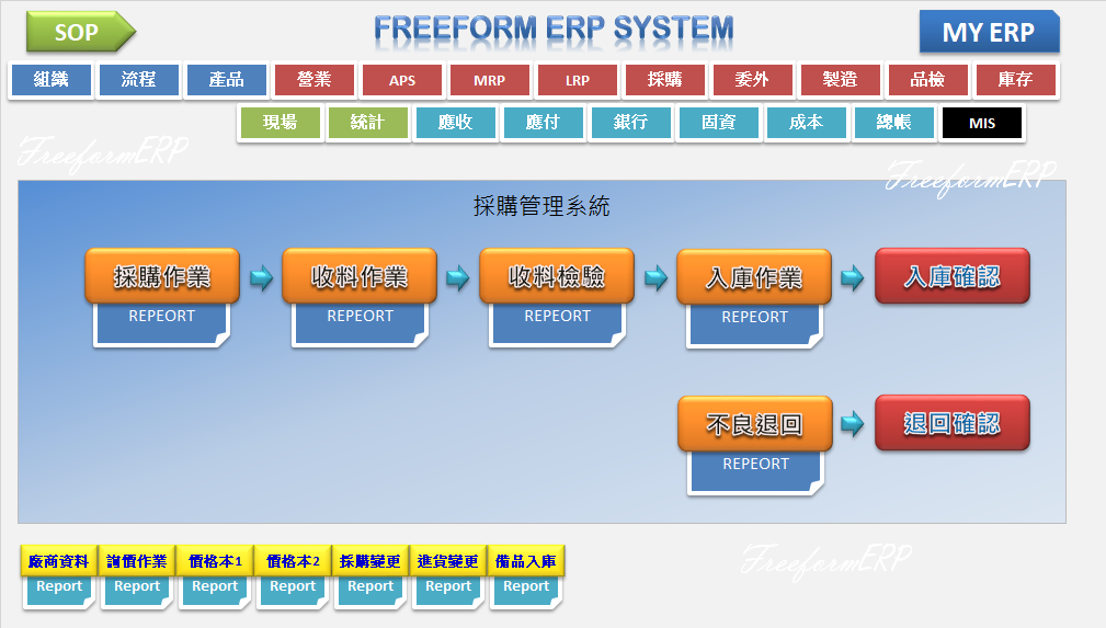 1. 廠商價格管理。 2. 採購訂單管理。 3. 收料作業。 4. 入庫作業。